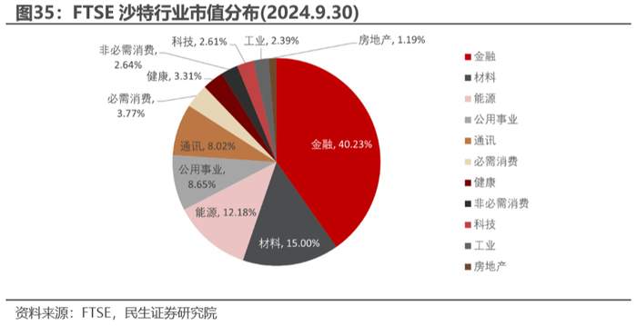 目前国内的沙特ETF跟踪的指数基本为富时沙特阿拉伯指数(FTSE Saudi Arabia Index,FTSE沙特)而非沙特全指,其权重相较沙特全指略有差异。从指数的行业权重分布来看,富时沙特阿拉伯指数中占比最高的是金融行业(40.23%),其次材料(15.00%)、能源(12.18%)、公用事业(8.65%)等。对比来看,富时沙特阿拉伯指数的金融行业权重更高而能源板块更低,但是差异相对不大。富时沙特阿拉伯指数与沙特全指的行业分布差异主要来自于其外资可投性要求。尽管沙特阿美在总市值极高,但是其大部分股权均由沙特政府及其关联方持有,因此在富时沙特阿拉伯指数中的权重较低。