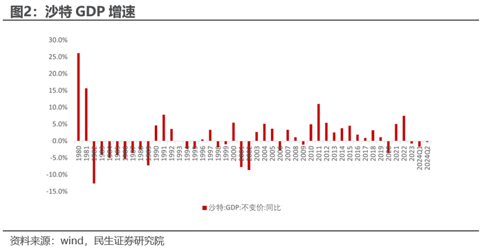沙特虽2023年来整体GDP出现收缩的原因主要为石油减产的结果,非石油经济则仍保持较快增速。沙特(OPEC+)2022年以来减少石油产量带来的石油部门产出的降低是沙特整体GDP同比减少的核心原因,石油部门2023 年同比收缩9.0%,2024 年Q1收缩11.2%,2024 年Q2收缩8.5%。而非石油部门则继续录得强劲增长,非石油部门2023 年同比增长 4.4%,2024 年第一季度增长 3.4%,2024 年第二季度增长 4.4%。
