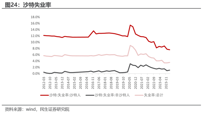 2024年Q1沙特的失业率为3.5%,整体维持较低水平,但是需要注意沙特公民与外籍人员的失业率存在显著差异。2024年Q1沙特公民的失业率为7.6%,而外籍人员的失业率则仅为1.1%。从边际变化来看,2023年以来沙特的失业率无论是本国公民还是外籍人士都有明显的下降,2024年Q1外籍人员失业率虽有小幅上升但是幅度并不大,整体失业率仍然维持较低水平。