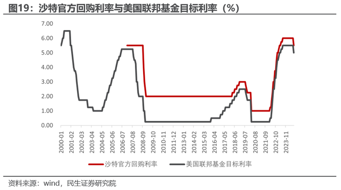 由于汇率与美元固定挂钩,沙特的货币政策基本与美联储保持一致。根据三元悖论原则,资本自由流通、固定汇率、独立的货币政策不可三者兼得。当美联储加息时,沙特也会跟随加息,保持货币政策一致以防止资本外流,反之亦然。因此沙特的货币政策独立性相对较弱。