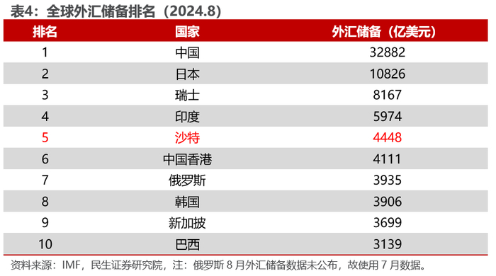 沙特的货币沙特里亚尔(SAR)长期以来与美元(USD)保持固定汇率,约为1美元兑3.75里亚尔。沙特作为全球最大的石油出口国之一,石油交易通常以美元结算,而固定汇率减少了汇率波动对沙特石油出口收入的影响。沙特央行(SAMA)通过管理外汇储备和货币政策,确保汇率的稳定性。截至2024年8月沙特外汇储备为4448亿美元,位列全球第5。