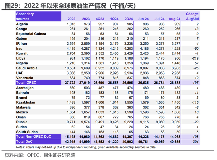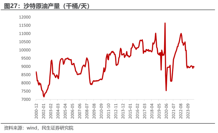 沙特阿拉伯是OPEC的创始成员国之一,也是该组织中最具影响力的国家。2022年10月,沙特和其他OPEC+成员国同意减产原油,旨在对冲石油需求的下行风险,并推高下跌的原油价格。2023年5月,沙特阿拉伯和几个OPEC+成员国进一步削减原油产量。此后沙特维持减产决定截至2024年9月底仍未变更,产量保持在约900万桶/天,为2011年以来的低位。