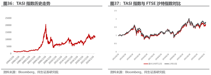 尽管TASI指数和FTSE沙特指数二者在行业权重上存在一定差异,但是从指数的历史表现来看,二者并不存在显著差别。两个指数自2012年以来的走势的高度一致,考虑到TASI指数历史数据更长,后续我们对于沙特市场的讨论均基于TASI指数。