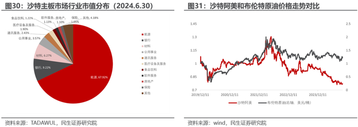 证券市场视角来看:沙特证券交易所是全球第九大的股票市场,总市值来看能源行业占比超过65%;投资者结构上,沙特市场主要由机构投资者主导;沙特的主要股指为沙特全指(TASI),由于指数对单一股票的权重限制,其行业权重最高的是金融,其次才是能源。沙特全股的股息率较高,有一定的红利属性。