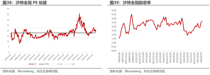 从近期市场表现来看,沙特全指2024年9月30日点位为12226,较2023年初累计上涨16.7%。沙特全指PE估值20.37,是2007年以来的80.4%分位数(过去10年的70.6%分位数),目前估值仍处于相对高位。沙特全指的股息率为3.65%(过去10年均值为3.16%),长期股息率较高,具备一定的红利属性。
