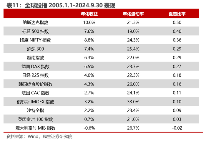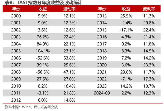历史来看沙特市场不同年度间收益波动较大,一定程度上受到国际油价波动影响。2000年-2024年9月30日,TASI指数年化收益7.5%,年化波动率为20.97%,夏普比率0.36。2016年-2024年8月31日,TASI指数年化收益6.7%,年化波动率为15.90%,夏普比率0.42。