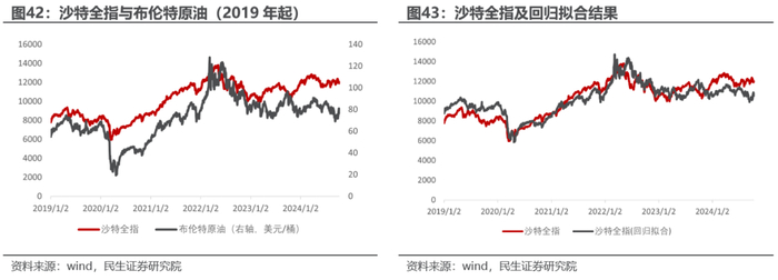 国际油价的波动对于沙特股指走势的影响比对盈利预期的影响更为显著案。我们仍旧采用单变量回归的方式,以布伦特原油价格为自变量,去拟合沙特全指价格变化。回归分析显示,自2019年至今的R2达到了75.5%。油价变动对股指价格影响更为显著的原因或为分析师一致预期变动不够高频,存在一定滞后性。