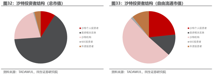 从投资者结构来看,沙特股市是机构投资者主导的市场。总市值视角下,政府相关实体占比64.91%、沙特机构占比21.46%、沙特个人投资者占比8.95%、外资投资者占比3.97%、GCC投资者占比0.71%,这很大程度上是因为沙特阿美大部分股权由沙特政府及关联方持有。而在自由流通市值视角下,沙特机构占比为51.45%、沙特个人投资者占比23.3%、政府相关实体占比13.3%、外资投资者占比10.63%、GCC投资者占比1.31%。