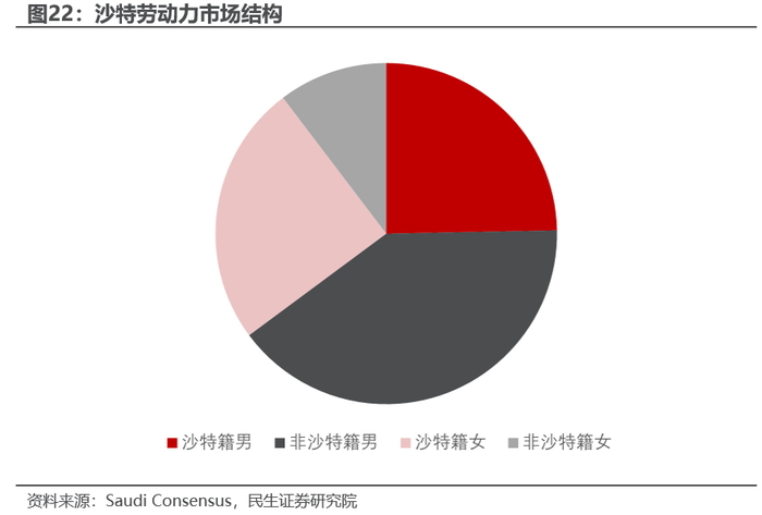 沙特是新兴市场中最年轻的国家之一,劳动年龄人口占比72.8%;其劳动力市场的一大特征是外籍劳工比例大。