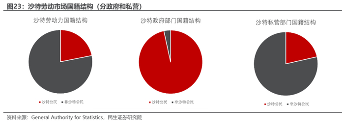 沙特籍人士更倾向于在政府部门就业,私营部门则以非沙特籍为主。在沙特阿拉伯就业的1596万人中,有1247万是外籍人士,约占总就业人口的78.1%。其中96.6%的政府部门工作人员是沙特本国人,而78.6%的私营部门劳动力是外籍人士。
