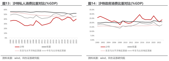 沙特政府消费占比高,而私人消费占比相对较低,主要消费动力依赖政府支出。与其他地区国家相比,沙特私人消费占GDP的比重长期偏低,尽管2011年以来有明显的上行趋势,但是还是不及平均水平(2023年:沙特40%,欧盟52%,东亚与太平洋地区44%,中东与北非46%)。而沙特政府消费占GDP的比重则维持在较高水平(2023年:沙特23%,欧盟21%,东亚与太平洋地区16.7%,中东与北非17.5%),这反映了沙特政府在提供公共服务、基础设施建设和社会福利方面投入了大量资金,且其经济在一定程度上依赖政府支出以维持增长。