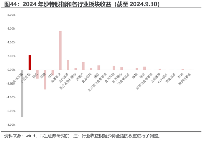 非石油经济的发展是今年来沙特在石油下行期间仍能增长的重要动力。2024年截至9月30日,布伦特原油价格下跌6.84%,但是沙特全指这一期间却上涨2.16%,我们可以看到银行、能源等板块的确受到原油价格下跌的影响跟随下跌,但是公用事业、通讯服务、房地产等非石油板块却有着极高的涨幅。沙特2030愿景改革下经济多元化的发展为沙特的增长提供了向上动力。