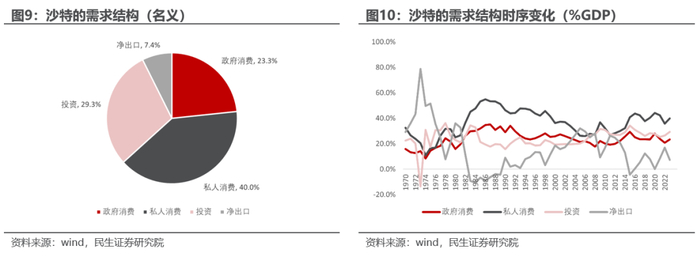 沙特是主要由出口驱动的经济体,2023年石油出口占总商品出口的比例为77.3%;私人消费占比相对较低,主要消费动力依赖政府支出;投资目前处于快速增长阶段。