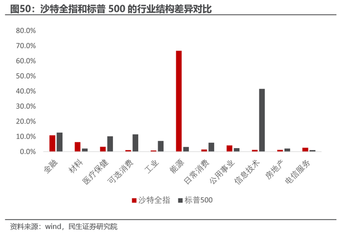 沙特是新兴市场中的资源出口国,结构差异带来与美股的低相关。作为以资源出口为核心的新兴市场国家,沙特产业以能源、金融为主,而科技、工业的比重都较低,与美股的行业结构存在显著差异,这是沙特市场和美股呈现低相关性的一个重要原因。