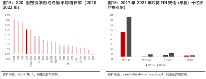 沙特投资目前处于快速增长阶段。以沙特国内资本来看,沙特2010-2023年固定资本形成总额年均增长率为5.1%,在G20国家中位列第四。“2030年愿景”实施以来沙特的外国直接投资也实现了快速增长,2017年到2023年存量同比增长61%,净流入也从2017年的40亿里亚尔增长到2023年的460亿里亚尔。