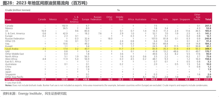 沙特还是世界第一大原油出口国。沙特2023年出口原油3.491亿吨,占全球总原油出口量的16.41%,其主要出口到中国、日本、韩国、印度和美国等国。2023年中国从沙特进口原油共计8590万吨,是沙特原油出口的最大市场,同时沙特也是中国继俄罗斯之后的第二大原油供应国。
