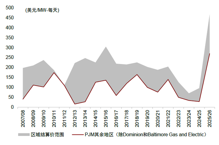 ► PJM容量价格创新高:2024年7月,PJM公布最新容量市场拍卖结果[3],2025/2026交付年的容量价格将达到每日269.92美元/兆瓦,较此前2024/2025年每日28.92美元/兆瓦增长约8倍,创历史新高。传统发电机组退役、数据中心等新增负荷抬升,叠加市场新规共同影响了本次竞价结果。PJM表示[4],已经退役或待退役的发电机组使得本次拍卖中供应量减少了约6.6GW,而峰值负荷预期增加了约3.2GW,主要是由于数据中心负荷增长和一个大型半导体设施投运。