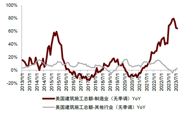 美国再工业化趋势明显。近年来,在逆全球化以及贸易保护主义思潮上升的大背景下,全球制造业产业链迎来重塑,带来新增产能投资需求。金融危机后,美国政府持续推动美国从去工业化到再工业化。从初期更多以经济内生因素主导,到特朗普政府时期逐渐加入了更多逆全球化思潮,以及拜登政府时期供应链安全的影响,支持力度不断加码。从总量数据上看,美国制造业建筑施工自2021年以来稳步复苏,2023年进一步得到加速。