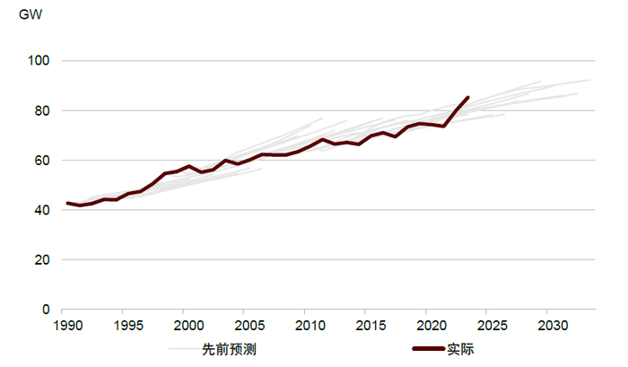 注:先前预测数据来自NERC ESD(电力供需)2023
