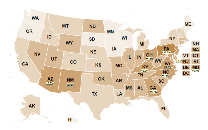 注:颜色越深代表增速越高;图上标注数字为上半年增速最高的十个州