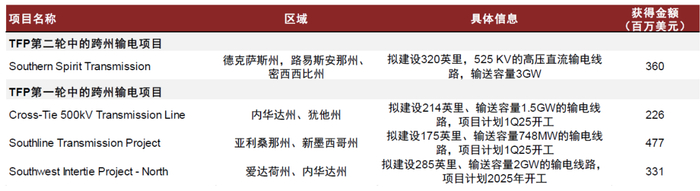 美国推动跨州输电线路以增强电网韧性,德州新项目有望成为打破“电力孤岛”的突破口。10月3日,美国能源部宣布通过TFP计划向4个输电项目投资15亿美元[13],主要计划购买由Avangrid、Invenergy、Pattern Energy、Grid United及其合作伙伴开发的输电项目容量。其中Pattern Energy的Southern Spirit输电项目连接了德州、路易斯阿那州、密西西比州。根据官网介绍[14],该项目是一条约320英里、电压±525kV的高压直流输电线路,输送容量3GW,能够将ERCOT电网和东南部输电网连接,项目计划在2028年全面开工并于2031年投运,提高电网可靠性,促进不同区域电网之间的资源连接,增强电网在极端天气的弹性。