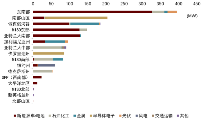 再工业化进程加速之下,制造业投资将带动用电量增长,提升对于电网容量、配电设备、供电可靠性及稳定性的需求。根据EPRI[6],2021年1月1日至2023年3月1日,美国境内宣布/在建/达产的新建或扩产项目超过155个,总共拉动年新增用电量超13,000GWh(不包括20个信息不足以估算用电量的项目),其中约2/3项目将在2025前投产,对应年新增用电量至少6,500GWh。我们认为部分新增产能投资密集区域的用电负荷紧张会更为明显。新能源/电池类制造商新增年负荷占据全部新增的50%,且多集中于东南部地区。
