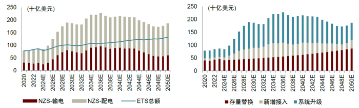 注:柱状图为净零情景(NZS)下的全球电网投资预期,折线图为经济转型情景(ETS)下的全球电网投资预期。净零情景(NZS)假设2050年实现净零排放;经济转型情景(ETS)仅纳入了已立法和确定的政策,未假设长期能源和气候目标得到实现。