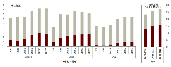 ► 公用事业公司:Exelon[15]最新投资计划规划2027年输电+配电投资达到82.5亿美元,2023-2027年间CAGR为6.6%,相较上一版本投资计划增速提高2.4ppt;Duke[16]最新投资计划规划2028年输电+配电投资达到71.8亿美元,其中输电投资达到28.5亿元,2023-2028年间CAGR为8.7%,年均投资额相较上一版本提高,输电+配电年均投资额相较上一版本提高31%;加州最大公用事业公司之一SCE[17]的2024年电网资本开支计划达47亿美元,较2023年提高12%,2025年较2024年再增长28%,其2024-2028年87%投入给配电网,主要为基础设施替换、山火防护,以及部署软硬件设备以增强电网可靠性。