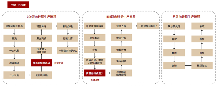 ► 技术方面:工艺流程长、关键工艺控制点多、工艺控制精度高。从高炉炼铁开始,经过冶炼、轧制及多道深加工流程最终制成成品,全流程有多达600多项工艺关键控制点,所有控制点必须同时全部达标,才能生产出合格的产品。控制精度方面,以钢水成分控制精度为例,一些主要成分含量需控制在±百万分之七范围内,检测精度、检测时间、工艺控制、原料质量控制需较长时间的磨合与优化。高质量的HiB取向硅钢比普通取向硅钢技术壁垒更高。