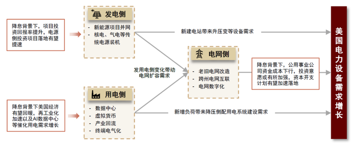 我们看好降息周期下,发用电侧投资景气上行,驱动美国电力设备需求和电网投资高增。具体来看:
