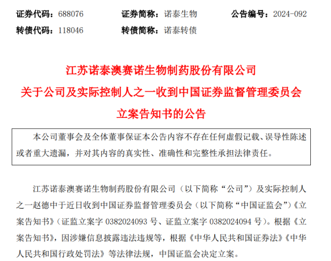 在资本市场的聚光灯下,企业的每一步走得都备受关注。10月23日晚,诺泰生物(688076.SH)发布公告称,公司及实际控制人之一赵德中于近日收到证监会《立案告知书》(证监立案字 0382024093 号、证监立案字 0382024094 号)。根据《立案告知书》,因涉嫌信息披露违法违规等,根据《中华人民共和国证券法》《中华人民共和国行政处罚法》等法律法规,证监会决定立案。