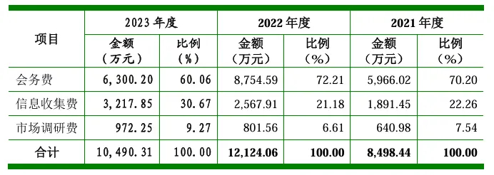 招股书显示,知原药业的学术推广费主要包括会务费、信息收集费、市场调研费等。其中,会务费主要系公司因开展学术会议、圆桌讨论会、专家讲座、患者教育会等产生的费用。2020~2023年,知原药业的会务费分别为 6399.38 万元、5966.02 万元、8754.59 万元和6300.20万元,占比分别为 67.95%、70.20%、 72.21%和60.06%,总体呈逐年上升趋势。