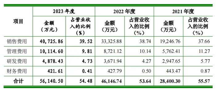 但事实,作为一家药企,知原药业的业绩驱动力,却不是研发,而是营销。拉长时间线来看,据其此前披露的新旧招股书显示,2020年~2023年,知原药业的销售费用分别为1.46亿元、1.92亿元、3.33亿元、4.07亿元,合计10.78亿,占各期营业收入的比重分别为37.72%、37.66%、38.74%和39.52%。