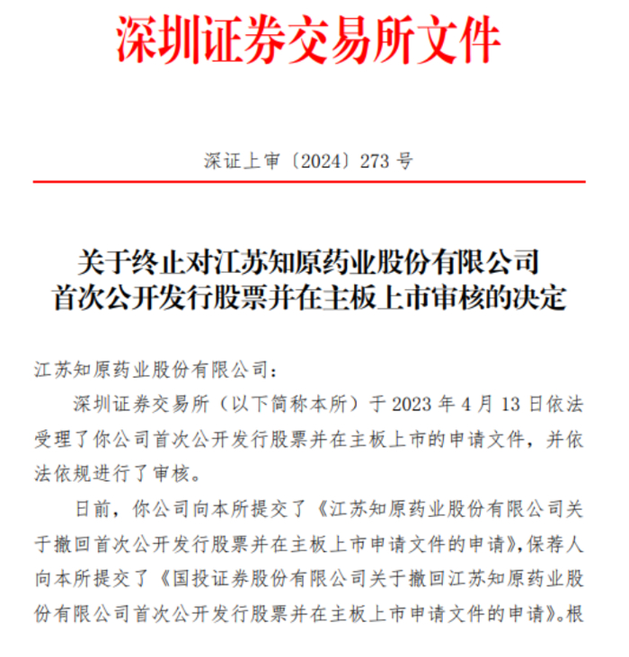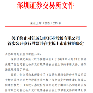 10月21日晚间,深交所网站公布了关于终止江苏知原药业股份有限公司(简称“知原药业”)首次公开发行股票并在主板上市审核的决定。