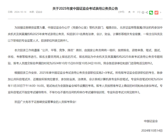 与2025届“国考”公告相应,证监会敞开大门,欢迎广大有志于证券期货监管事业的人员报考。