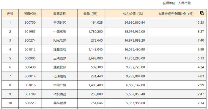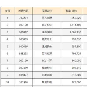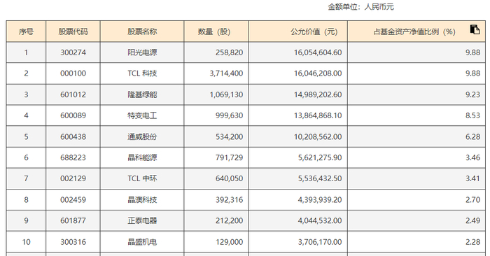 据最新披露数据,截止2024年6月30日,光伏ETF指数基金的重仓股如下表所示:
