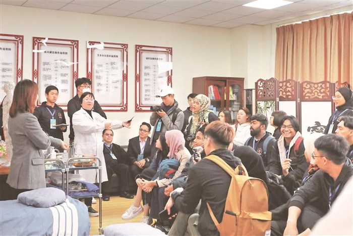 马来西亚师生来贵阳康养职业大学参加“桥见贵州,多彩如你”活动中医体验课。