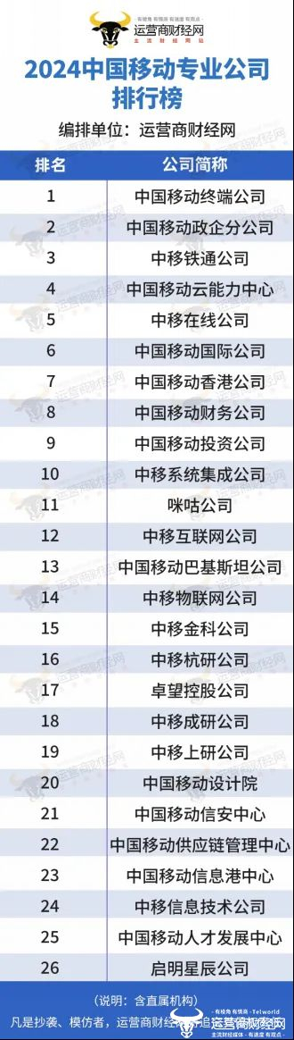 2024中国移动专业公司排名出炉!终端公司、政企公司、铁通排前三