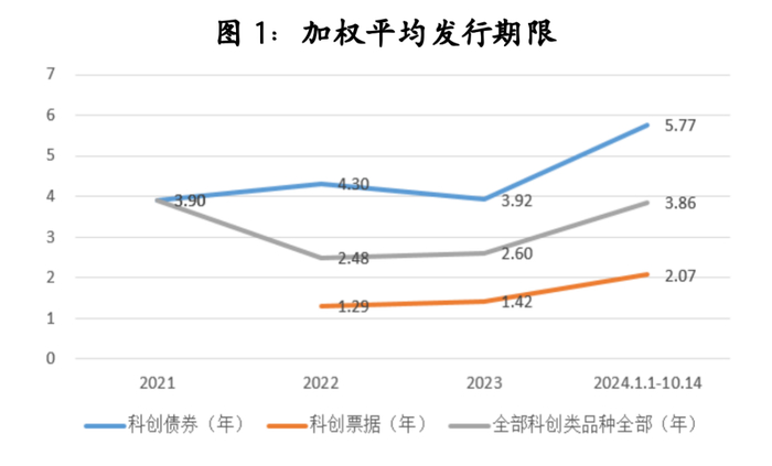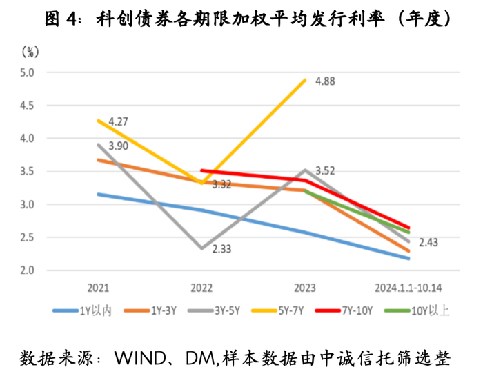 值得关注的是,2022-2023年,科创类债券部分期限出现利率倒挂现象,如2022年科创债券3-5Y品种加权平均发行成本低于短期限品种;2023年科创票据7-10Y和10Y以上品种加权平均发行利率均低于3-5Y品种,主要系宏观经济下行、货币政策逆周期调节短期效应和极致资产荒等共同影响所致。需警惕市场风险偏好上升周期中利差过度压缩的品种估值的加速回调风险。