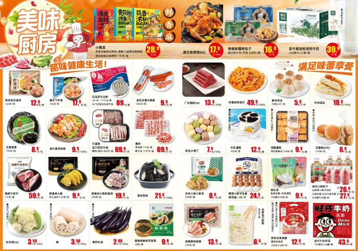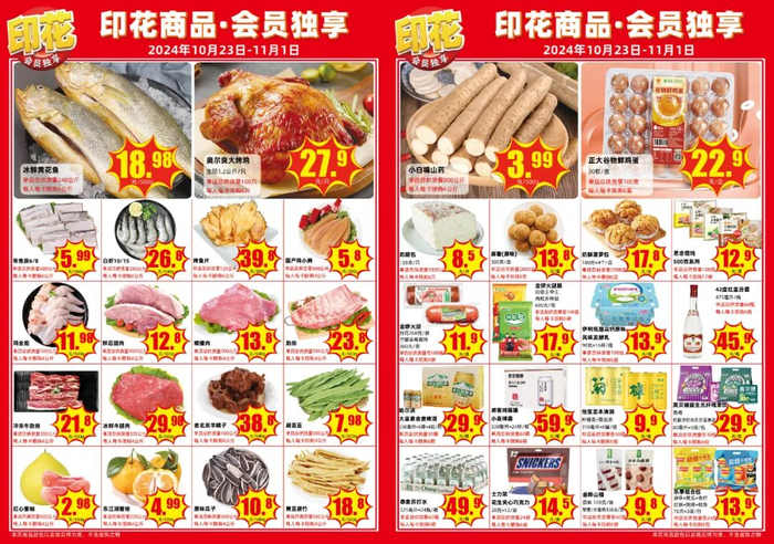 如大润发印花商品会员独享价:冰鲜黄花鱼18.98元一斤;小白嘴山药3.99元一斤;正大谷物鲜鸡蛋(30枚/盒)22.9元一盒;中裕多用途麦芯粉(4千克/袋)18.9元一袋;金龙鱼玉米胚芽油/葵花籽油(6.18升/桶)68.9元/桶……