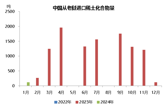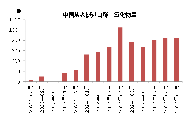2023年2月以来,我国开始从老挝进口稀土氧化物和化合物。2024年1-9月份,我国从老挝进口6749吨稀土氧化物,占同期氧化物总进口量的16.3%,进口品种全部为“未列名氧化稀土”;9月,老挝稀土氧化物进口量为848吨,环比持平,去年同期未有进口。今年以来,我国仅1月份从老挝进口115吨稀土化合物。