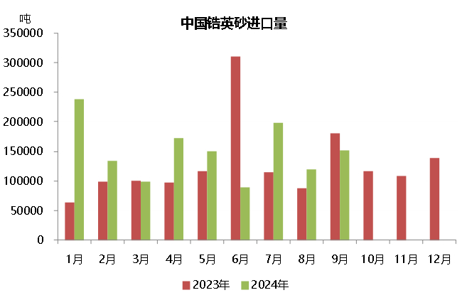 2024年1-9月份,我国进口135万吨锆英砂,同比增加15.3%。其中,9月份,锆英砂进口量为15.2万吨,环比增加26.6%,同比下降16%。
