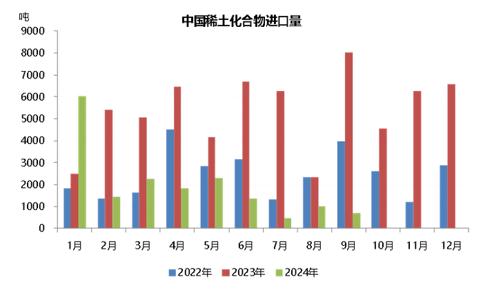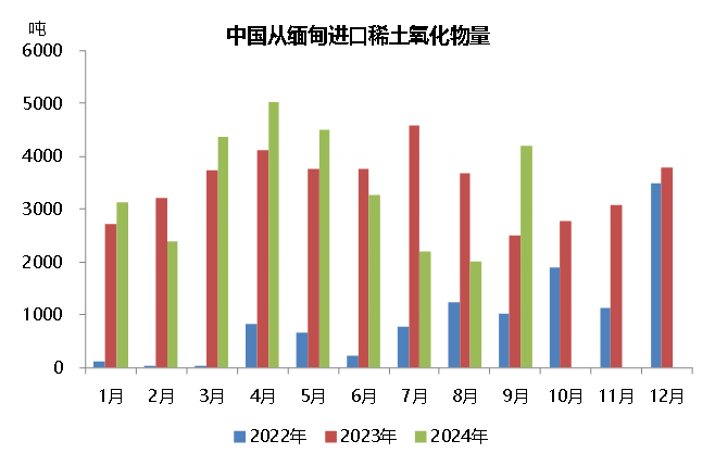 2024年1-9月份,我国从缅甸进口3.1万吨稀土氧化物,同比下降3%,占同期氧化物总进口量的74.9%,进口品种全部为“未列名氧化稀土”;1-9月,我国从缅甸进口8537吨稀土化合物,同比减少57.5%,占比达49%,进口品种全部为“其他未列名稀土金属及其混合物的化合物”。据测算,今年前9个月,我国从缅甸进口的稀土原料中(稀土氧化物和稀土化合物),REO总含量同比下降约10.8%。