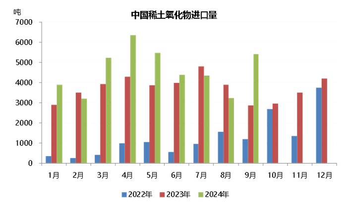 1-9月份,我国累计进口稀土氧化物4.2万吨,同比增长22%;9月份,进口稀土氧化物约5418.4吨,环比增长68.5%,同比增长90%。