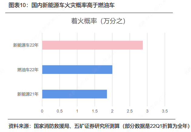 • 从国内火灾的概率上看,2022年新能源车火灾概率是万分之3,高于燃油车的万分之2。从危害性看,电池的着火速度等往往较快。