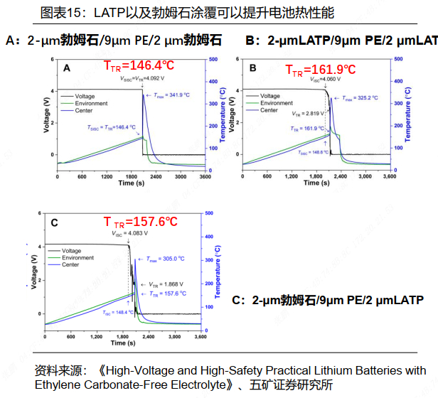 • 当前的固态电解质涂覆并非改善安全性的唯一方式。采用固态电解质涂覆、电解液的改变等方式均可以提升热失控温度(传统液态电池在130°C附近发生热失控)