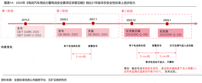 • 相关国标处于征求意见阶段,计划26年1月强制实施。其要求新能源车热扩散试验后(针刺、加热等)的电池包不着火不爆炸。