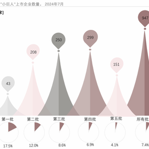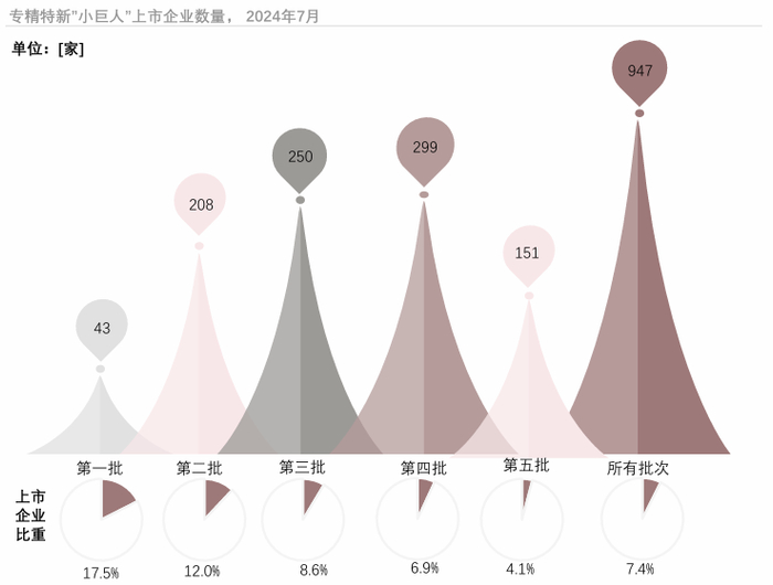 “专精特新”迎来市场风口,“小巨人”企业成为资本市场重点关注对象。截至2024年7月,在全部批次“小巨人”企业中,共有947家上市企业,且前四批次的上市企业数量均在不断增加。