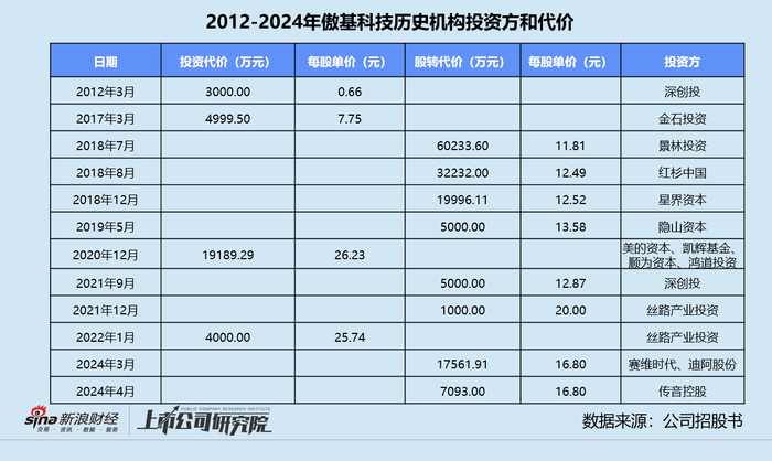 可到了2024年初,跨境电商赛维时代、珠宝公司迪阿股份、消费电子企业传音控股等上市公司参投之际,傲基科技的每股价格又下跌至16.80元。按照招股书披露的3.87亿股本数量计算,本轮投后估值最多不超过65亿元,与2020年最高点相比缩水36.2%,高价入股的丝路产业投资两轮投资分别浮亏19.0%、53.2%。