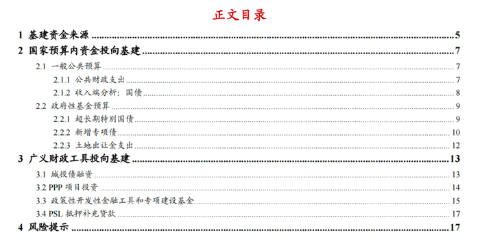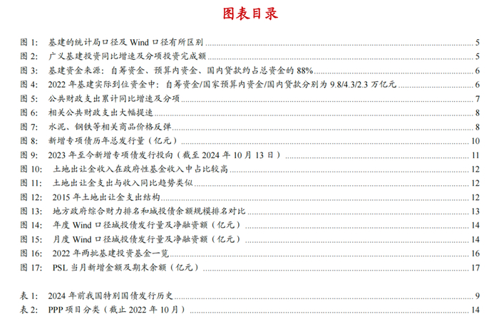 总体看,财政资金中直接投入基建的部分主要集中于国家预算内资金:包括一般公共预算支出(收入端分析国债)、新增专项债、超长期特别国债、土地出让金支出等。此外,广义财政工具投入基建资金亦需要重点关注:广义财政工具包括城投债融资、PPP项目投资、政策性开发性金融工具(基建投资基金)、专项建设基金、PSL抵押补充贷款等。